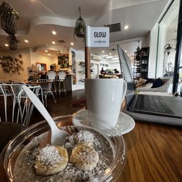 Customers rave about the diverse menu at Juicy Ladies, which includes everything from forbidden bowls to avocado sandwiches, salads, smoothies, and even coconut custard desserts. Reviewers appreciate the use of high-quality ingredients and the fresh, healthy options available. The cafe's interior exudes a calming boho vibe, with comfortable seating both inside and outside for guests to enjoy.